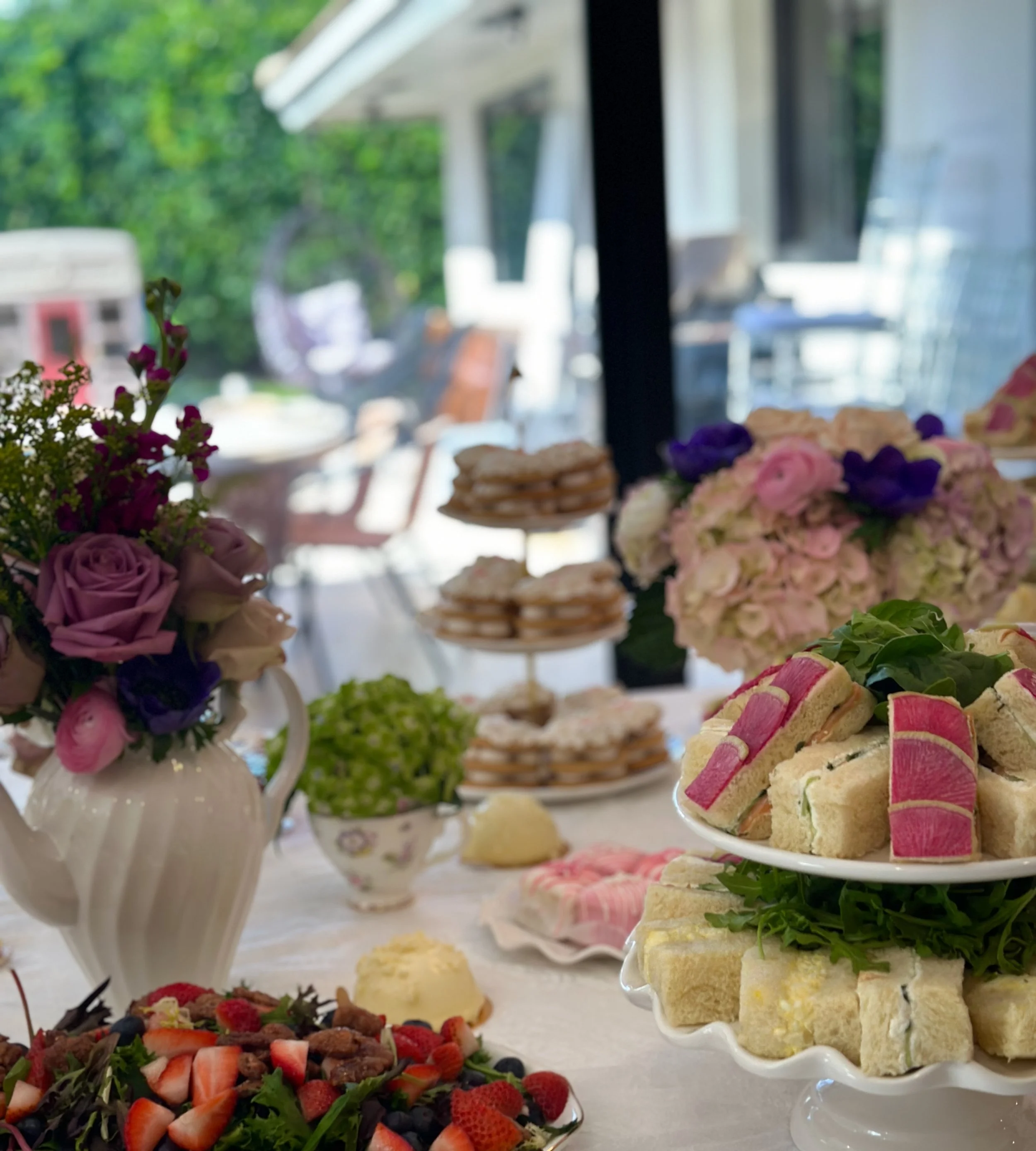 The Brunch Grazing table includes a variety of cheeses, pastries, bagels, breads, crackers, dried fruit, fresh fruit, pickled vegetables, vegetables, yogurt, granola, dips, jams, greek salad, caesar salad, caprese salad, egg salad, tuna salad, and a variety of smoked salmon. The brunch grazing table will be decorated with florals that match the theme of the event combined with wooden decor.
